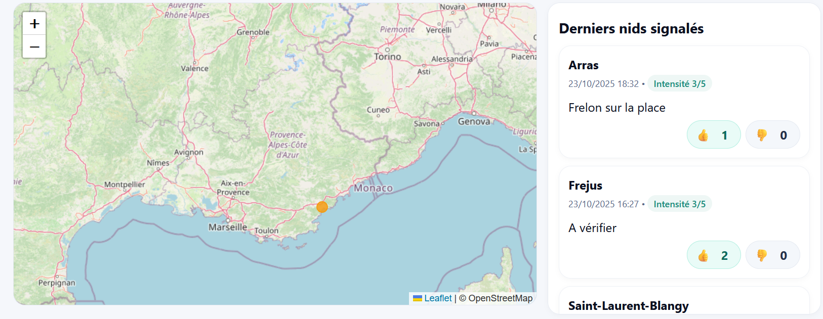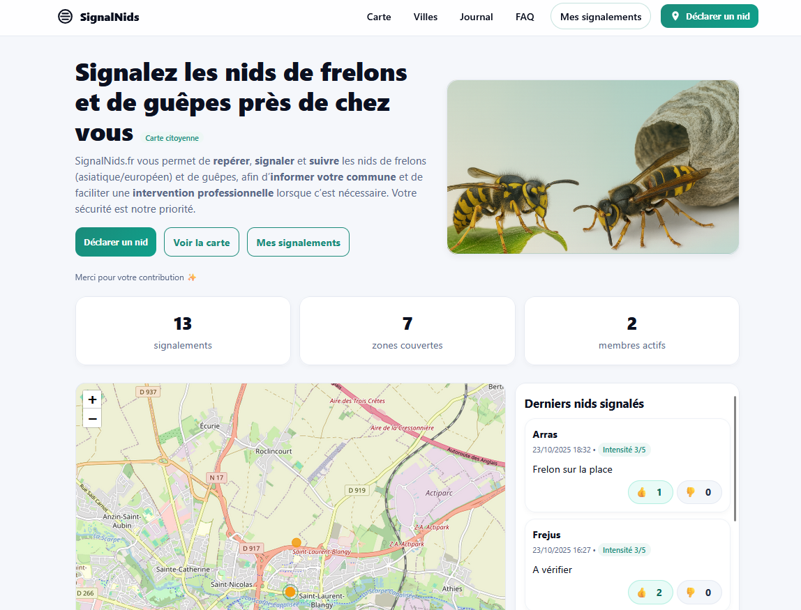 SignalNids est une plateforme citoyenne et ouverte qui permet de déclarer et cartographier les nids (frelons, guêpes…) en quelques secondes. L’objectif : informer le public local, faciliter la vérification communautaire et aider les collectivités / apiculteurs à prioriser les interventions.